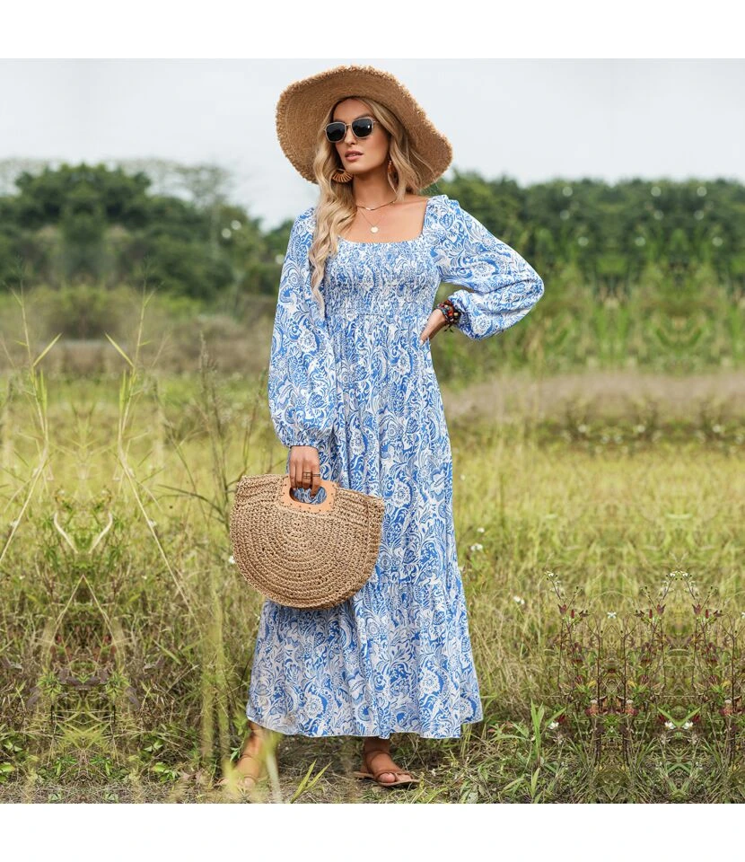 Square Collar Printed Long Sleeve Vacation Backless Swing Dress Wholesale Maxi Dresses N5323021600029