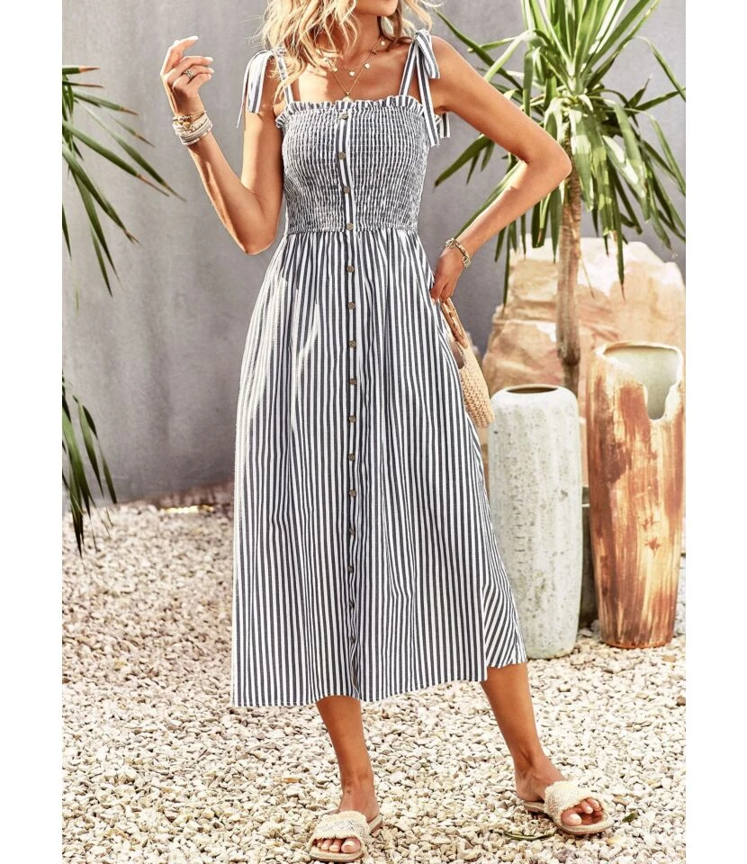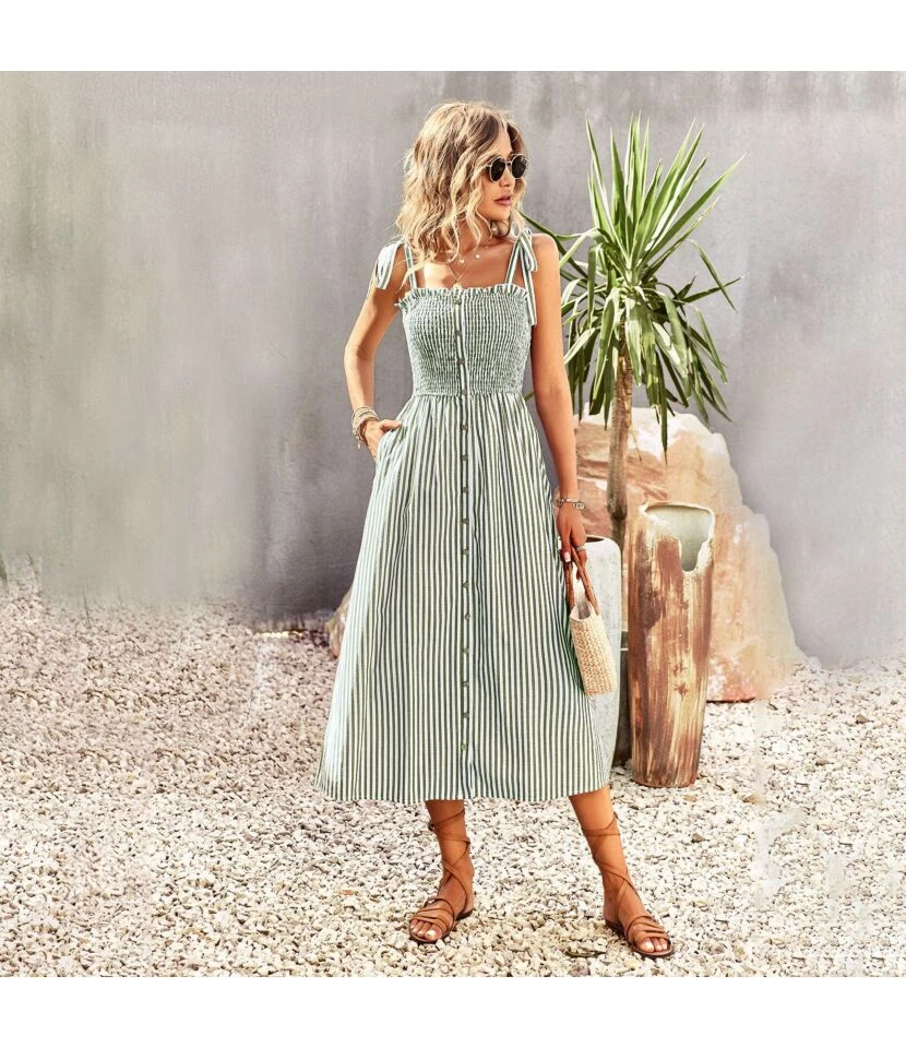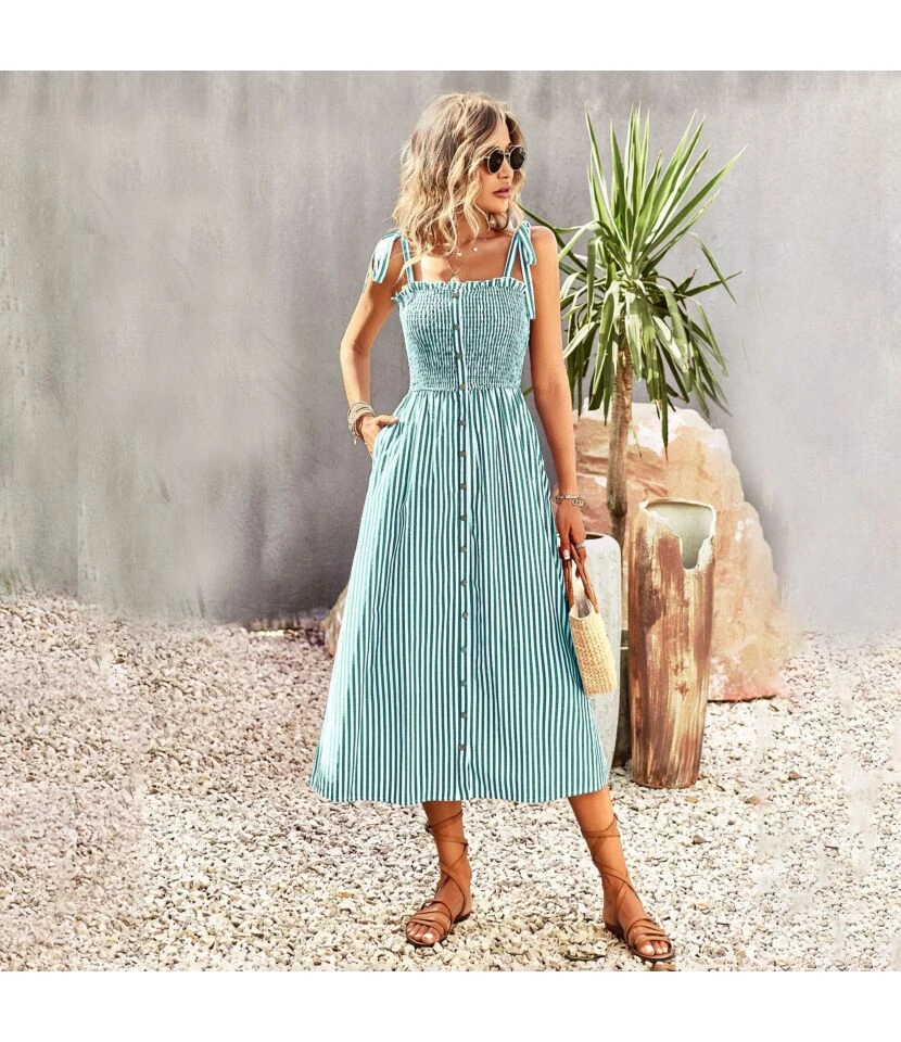Elegant Casual Fashion High Waist V-Neck Holiday Long Smocked Dress Wholesale Dresses N5323030700084