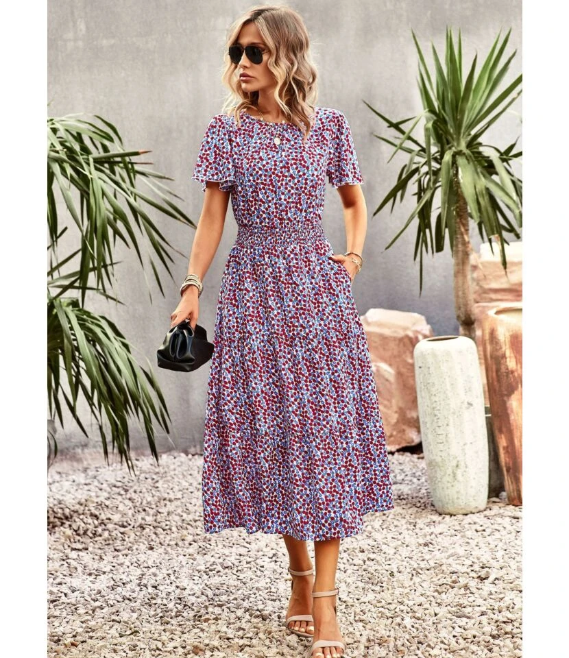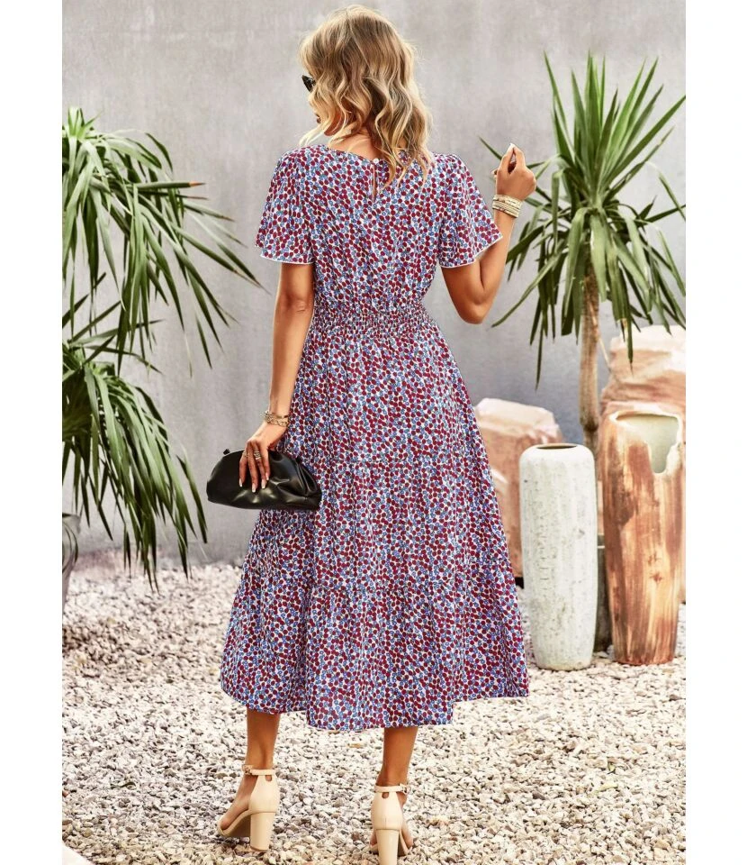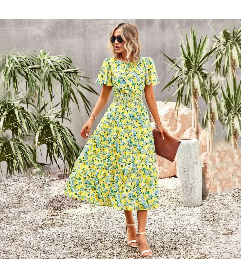 Summer Elegant Waist Trimming Short-Sleeved Long Floral Dress Wholesale Dresses N5323022800184