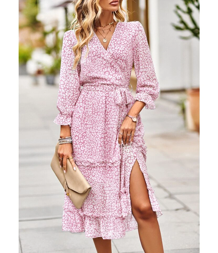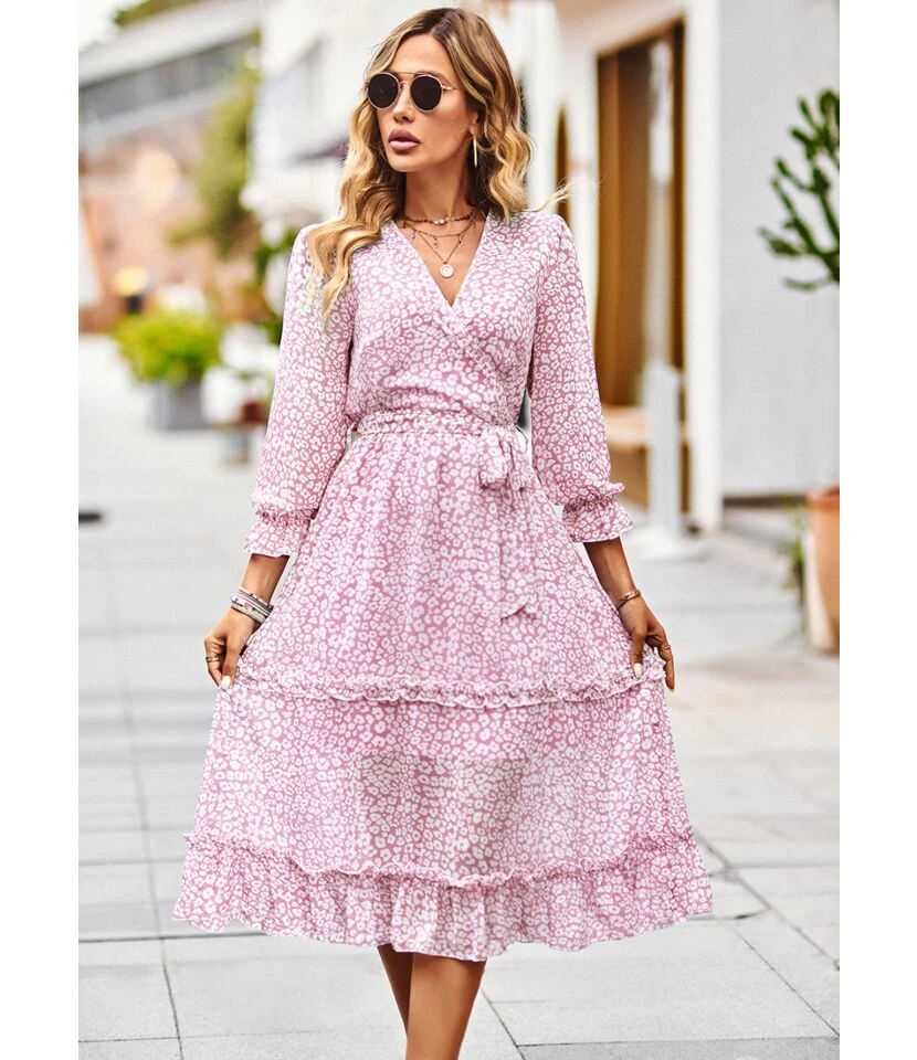 Temperament Elegant Tie-Up Waist V-Neck 3/4 Sleeve Floral Swing Dress Wholesale Dresses N5323022700047