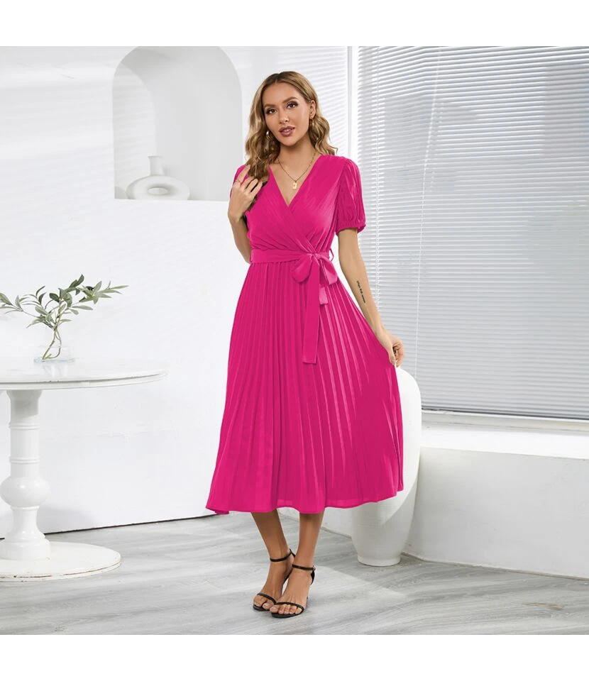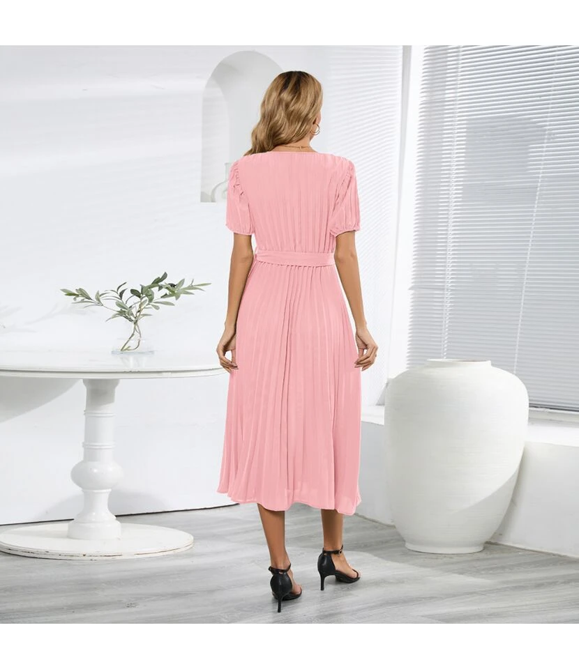 Temperament V-Neck Puff Sleeves Pleated Slim Solid Color Commuter Midi Dress Wholesale Dresses SDV464027