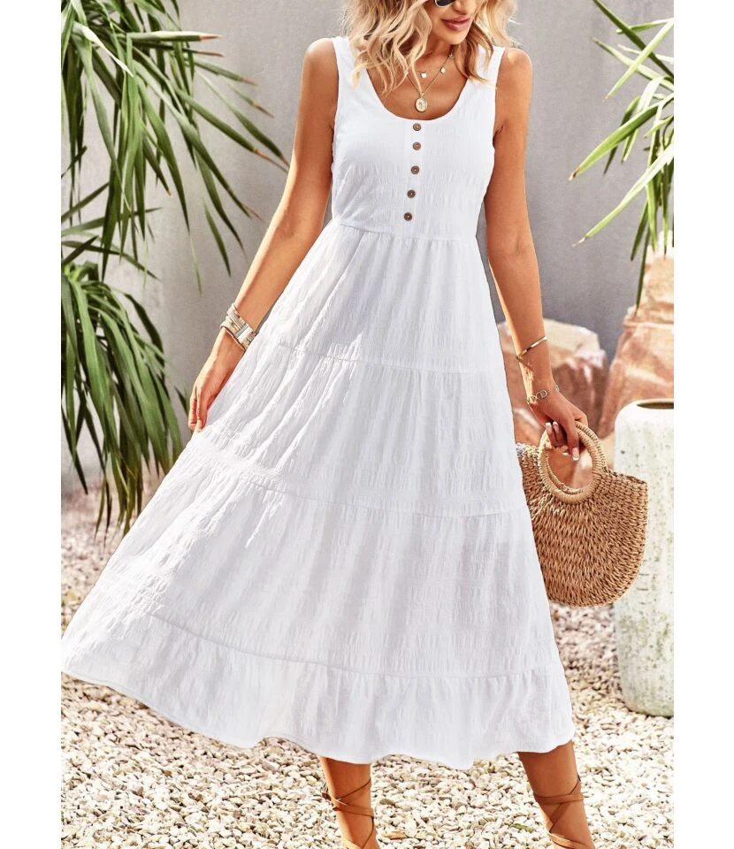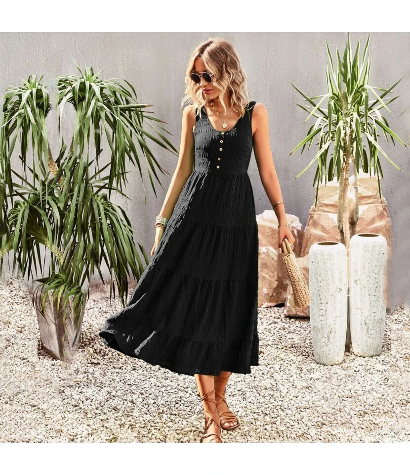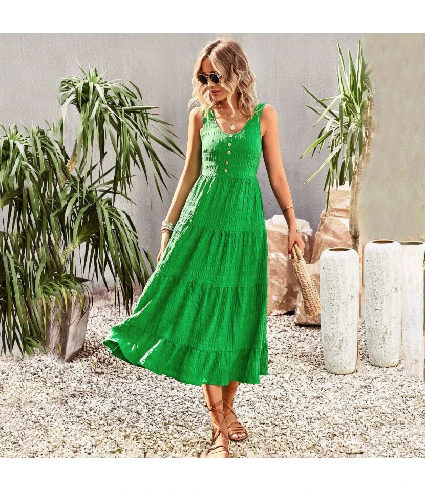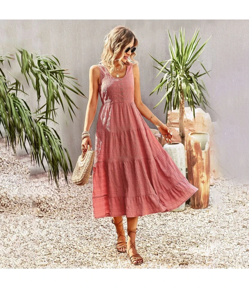 U Collar Sleeveless Solid Color Casual A-Line Suspender Smocked Dress Wholesale Dresses N5323030618101