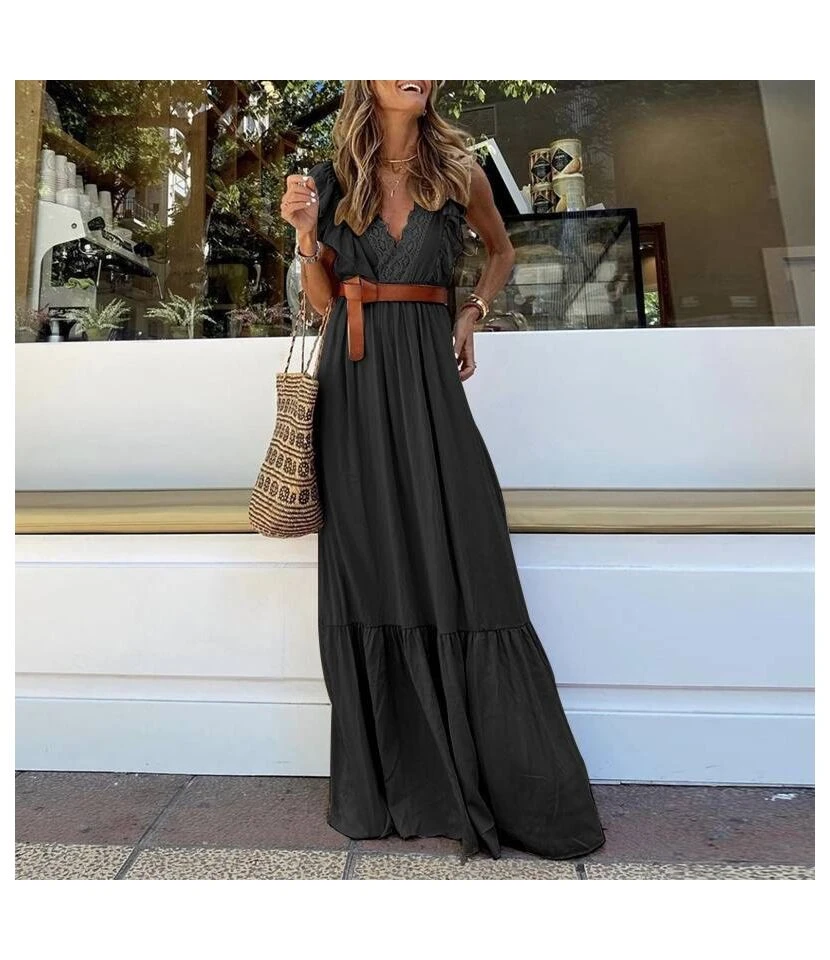 V-Neck Lace Pleated Sleeveless Flowy Dress Wholesale Dresses N462303280017224