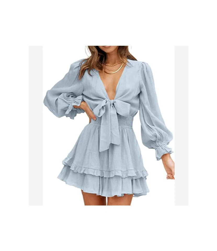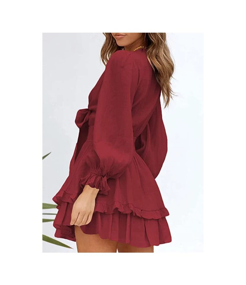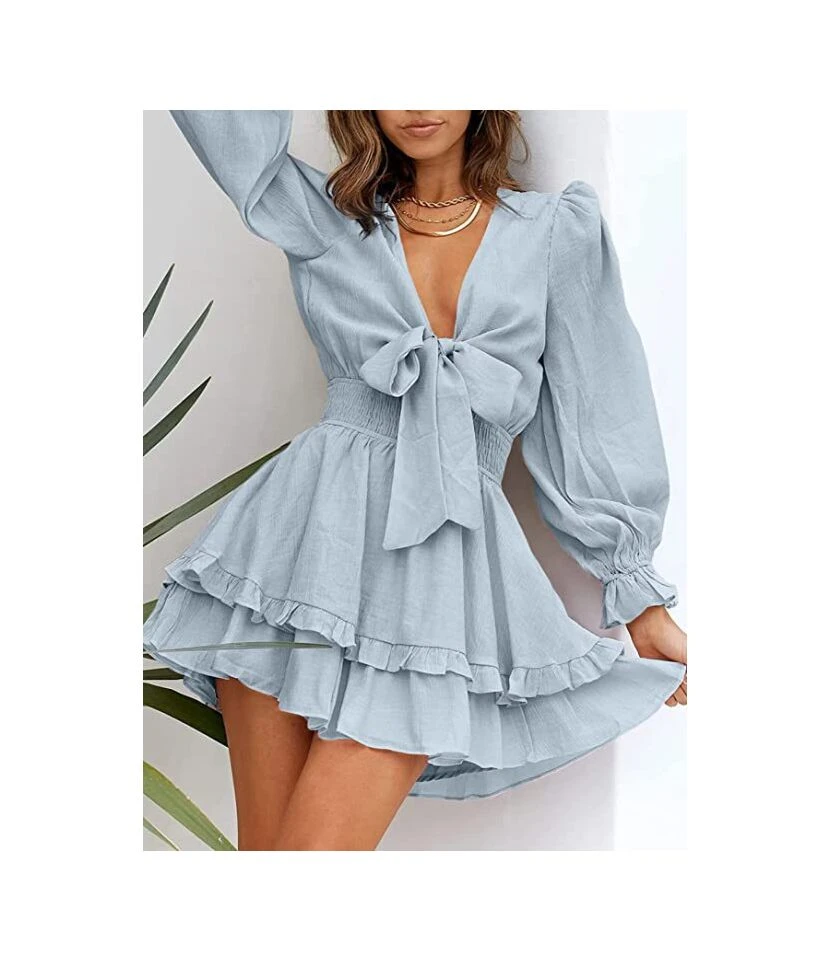 V-Neck Solid Color Tieback Bowknot Long Lantern Sleeve Ruffle Dress Casual Wholesale Dresses SD531178